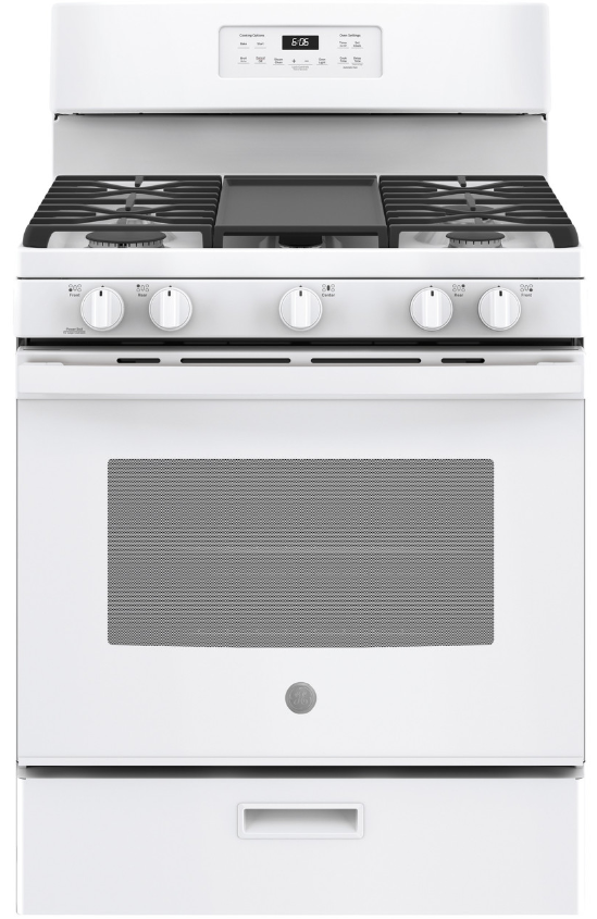 GE® 30" White Free Standing Gas Range with 5.0 cu. ft. total capacity, steam clean and extra large integrated non stick griddleRead More