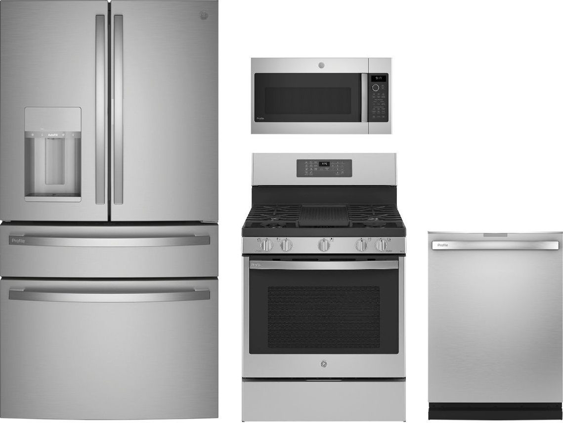 GE Profile™ 4 Piece Kitchen Package-Stainless Steel with a French door refrigerator, free standing gas range, built in dishwasher and over the range microwaveRead More